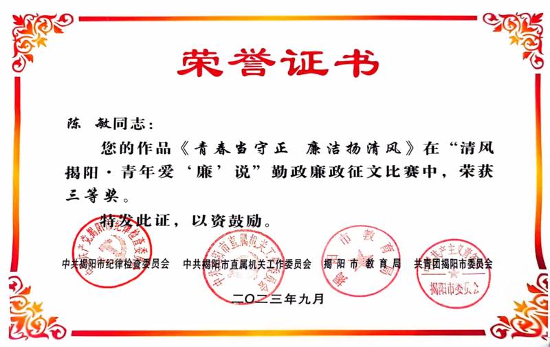 清風(fēng)潤初心,青年說清廉。為深入學(xué)習(xí)貫徹黨的二十大精神,強(qiáng)化廣大青年的廉潔自律意識,增強(qiáng)青年黨員干部廉潔從政、廉潔用權(quán)、廉潔修身、廉潔齊家的思想自覺,切實做好青年廉潔文化建設(shè)工作,市紀(jì)委、市直工委、市教育局、團(tuán)市委聯(lián)合舉辦“清風(fēng)揭陽·青年愛‘廉’說”勤政廉政征文比賽。揭陽市投資控股集團(tuán)有限公司陳敏參加征文活動,并榮獲三等獎。